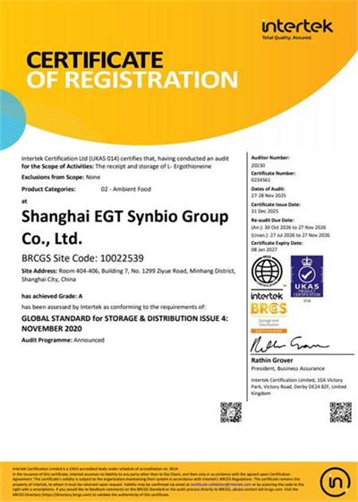 在創(chuàng)思維驗廠網(wǎng)老師專業(yè)技術、全程跟進耐心細致輔導以及公司全體員工配合下,一次性順利通過BRC認證并取得A級證書,為將來公司發(fā)展奠定了良好的發(fā)展基礎,既開拓了市場同時也增加了消費者對公司的信賴,在這里再次祝賀上海麥角硫因科技有限公司2025年一次性成功通過BRC認證并取得A級證書,同時也期待未來再次與創(chuàng)思維驗廠網(wǎng)合作!
