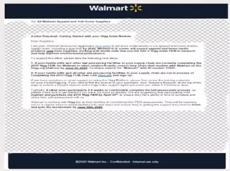沃爾瑪要求下屬服裝和家紡行業(yè)的供應(yīng)商全面實(shí)施 HIGG FEM自評(píng),并正式下達(dá)了通知函,具體內(nèi)容如下: